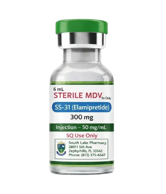 SS-31 Elamipretide is a compounded prescription peptide. It is not FDA-approved or evaluated by the FDA for safety, efficacy, or quality. A valid prescription from a licensed healthcare provider is required. Must be 18 or older to order. Not available for shipping to Alabama, California, DC, Louisiana, Massachusetts, Michigan, Mississippi, Montana, Texas, Washington, or West Virginia. Consult your provider before use if you have existing neurodegenerative, cardiovascular, or mitochondrial conditions, or if you are currently taking immunosuppressants or other injectable medications.