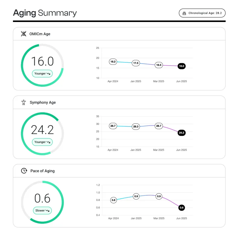 See how your biological age compares to your chronological age and whether your body is aging faster or slower than expected — giving you clear insight into your long-term health trajectory.
